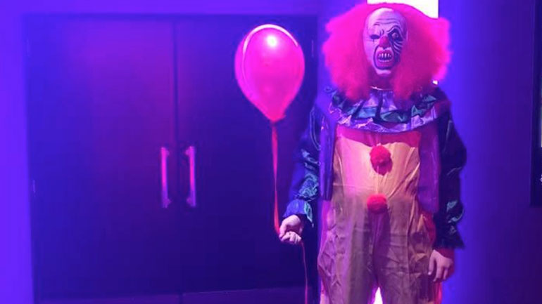 Страшный клоун с красным шариком.