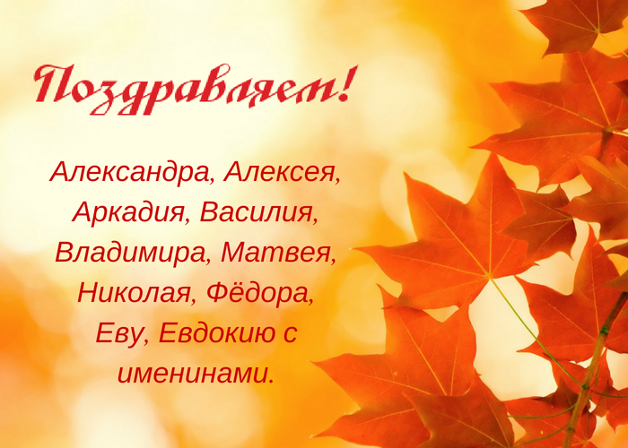 Поздравляем Александра, Алексея, Аркадия, Василия, Владимира, Матвея, Николая, Федора, Еву, Евдокию с именинами.