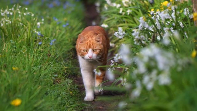 Кот весной на траве.