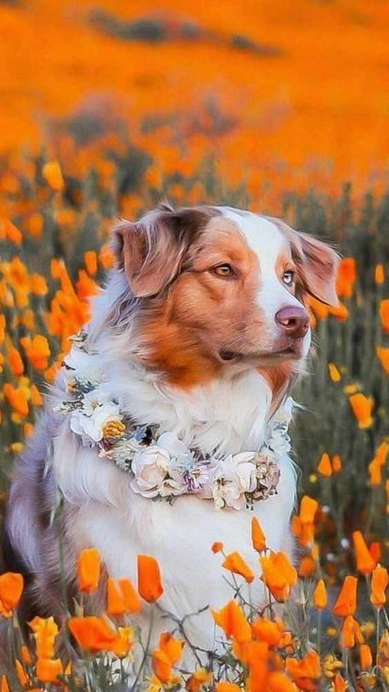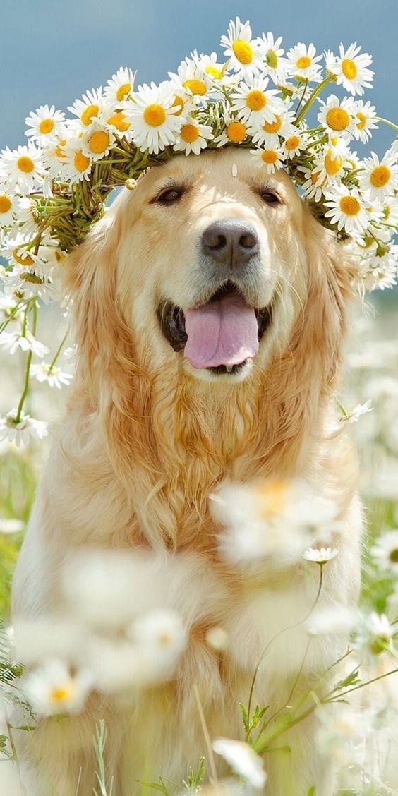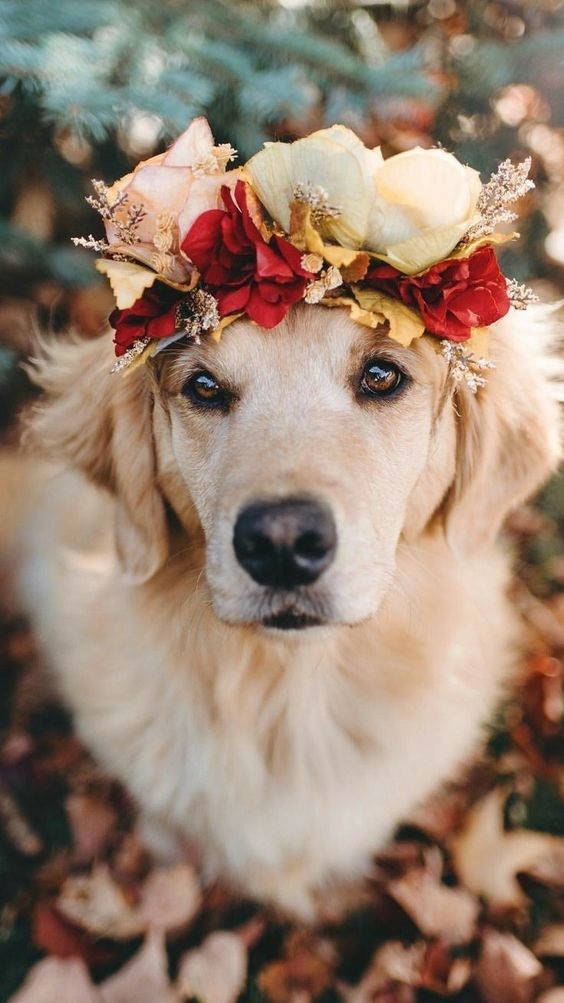 Собачка в веночке на обои телефона с животными.