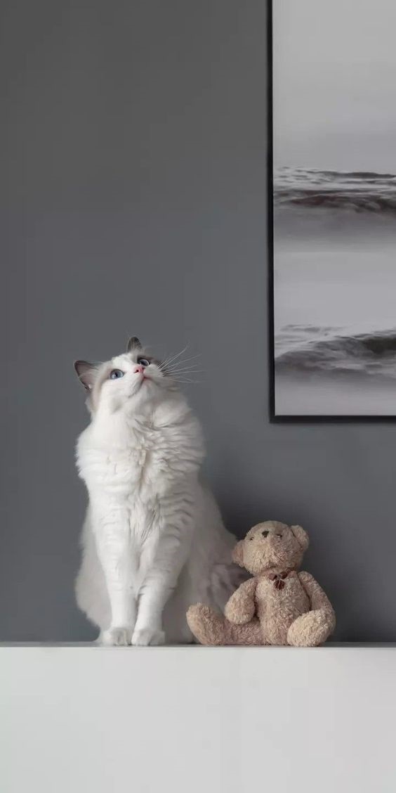 Котик и плюшевый мишка.