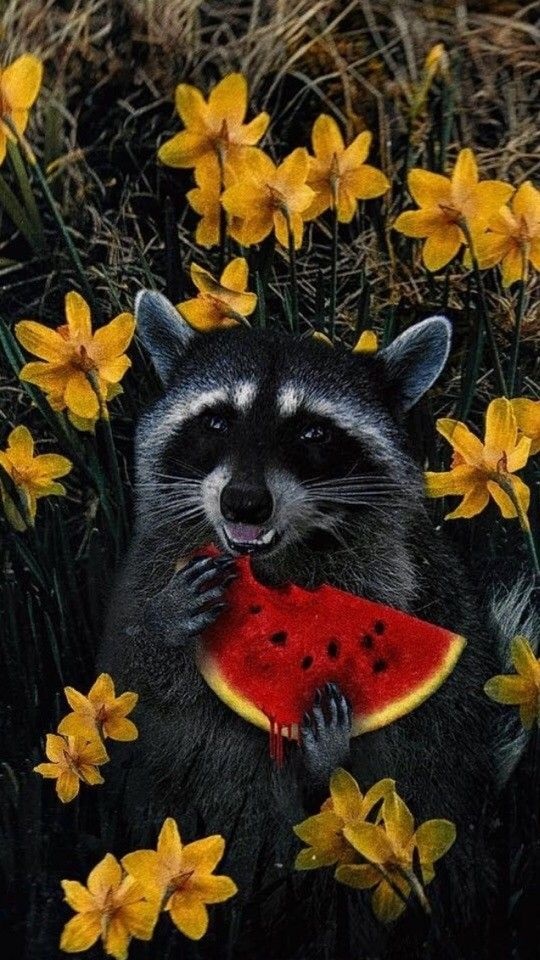 Красивый енот с арбузом.